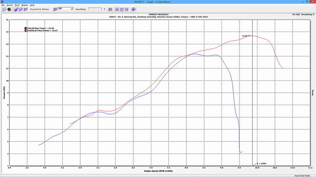 Dyno Comparison of KYMCO VJR with the Factory ECU and the EzKISS(TM) ECU (Using Dynojet SD12 Scooter Dyno)